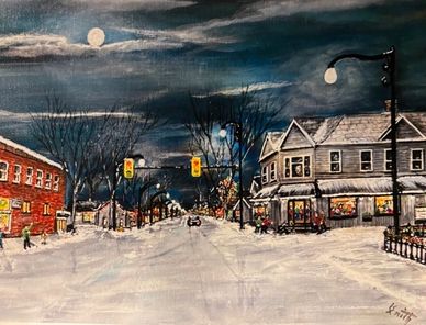 Inspired while driving by the Wooden Shoe Restaurant, (shown on the right), on a snowy evening in December and seeing the joyful patrons coming and going. This scene was highlighted by the beautiful sky and atmosphere and the Christmas lights.
