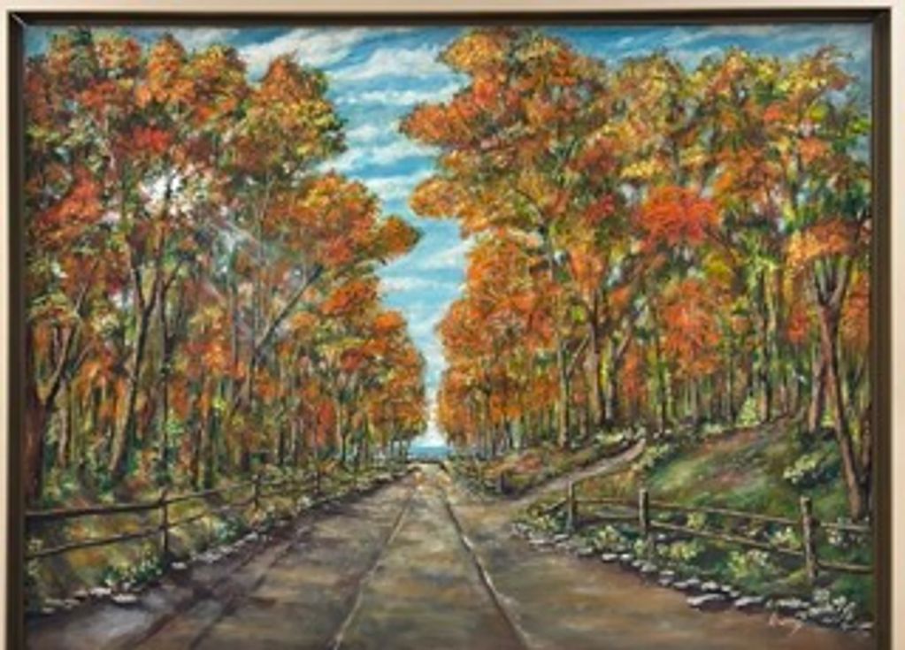 This painting was inspired by the beauty of the North Woods in Michigan in the Autumn. The lonely dirt road leads the viewer along a serene forest setting with Lake Michigan in the distance.