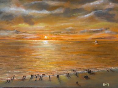 Inspired by a brilliant sunset on Marco Island, 2025. The brilliant oranges and golds backlit the amazed onlookers in this rare and beautiful display of nature.